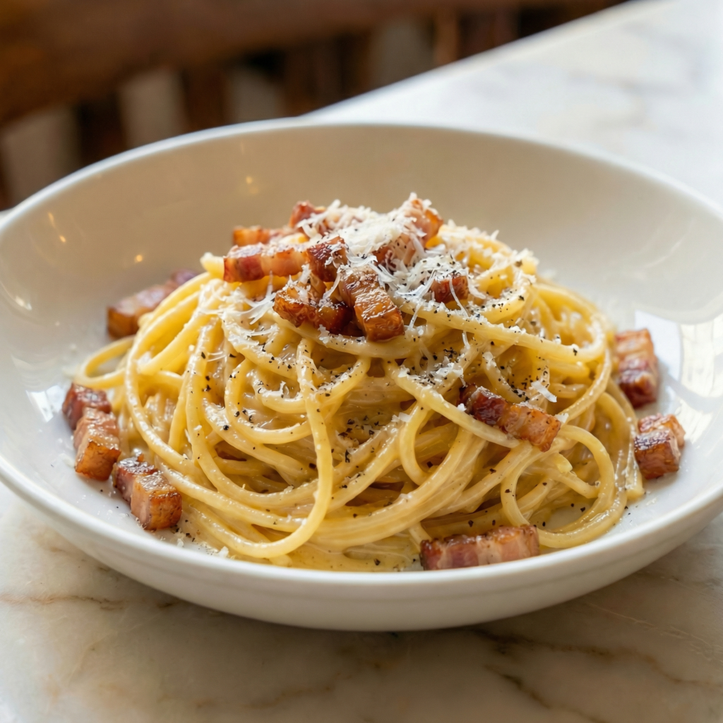 Spaghetti alla Carbonara works because it balances heat, timing, and technique. Crisp guanciale provides texture and flavor while hot pasta creates an emulsification with the egg and cheese mixture.