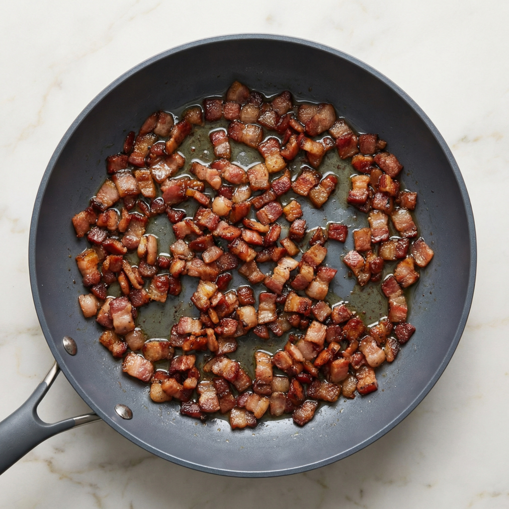 Cook for 4–6 minutes until golden brown and crispy, stirring occasionally. The rendered fat will become the flavorful base for the sauce.