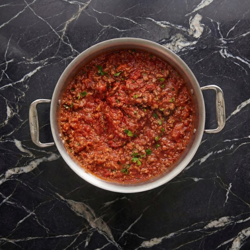 Pour the marinara sauce and crushed tomatoes into the skillet with the cooked meat.